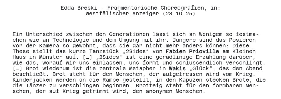 Die Leitfrage von Yoshiko Wakis Schaffen lautet: „Was passiert, wenn Tanz und Realität zusammenstoßen?“ Ab Oktober 2025 präsentiert Tanz Münster GLÜCK im letzten Teil des Tanzprogramms GENERATION GAP am Theater Münster. Diese Ausschnitte stammen aus Yoshiko Wakis Koproduktion GLÜCK / LAIMĖ ⧹СЧАСТЬЕ mit der Company AURA in Litauen. Im Jahr 2017 wurde mit diesem Werk auch das Kaunas International Dance Festival eröffnet. Fast zeitgleich bringt Waki mit bodytalk diesen Herbst auch die Westfalen Side Story heraus.